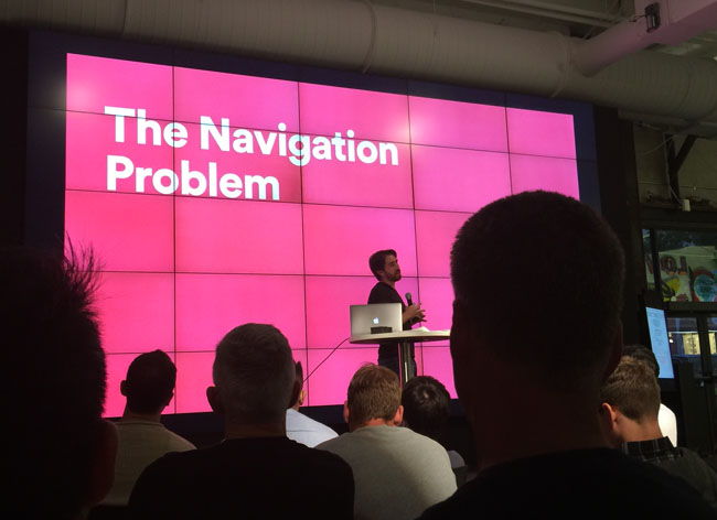The second half of Leland's talk focused on a topic that is dear to me: the Navigation problem in React Native. He talked about the abundance of navigation libraries in React Native, both first party and third party. NavigationExperimental was mentioned as something that seemed promising, but ended up not being well suited for their use case.